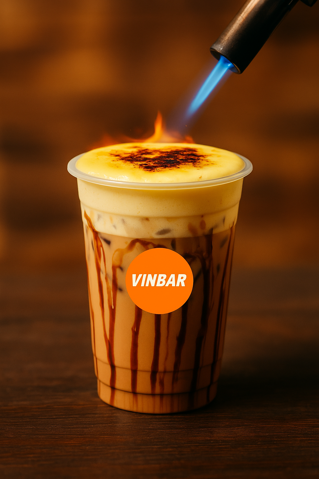 - Bước 3: Rót cốt trà sữa vào giữa ly. Đá và nước cách miệng ly 2cm. Thêm 110ml kem trứng lên trên.