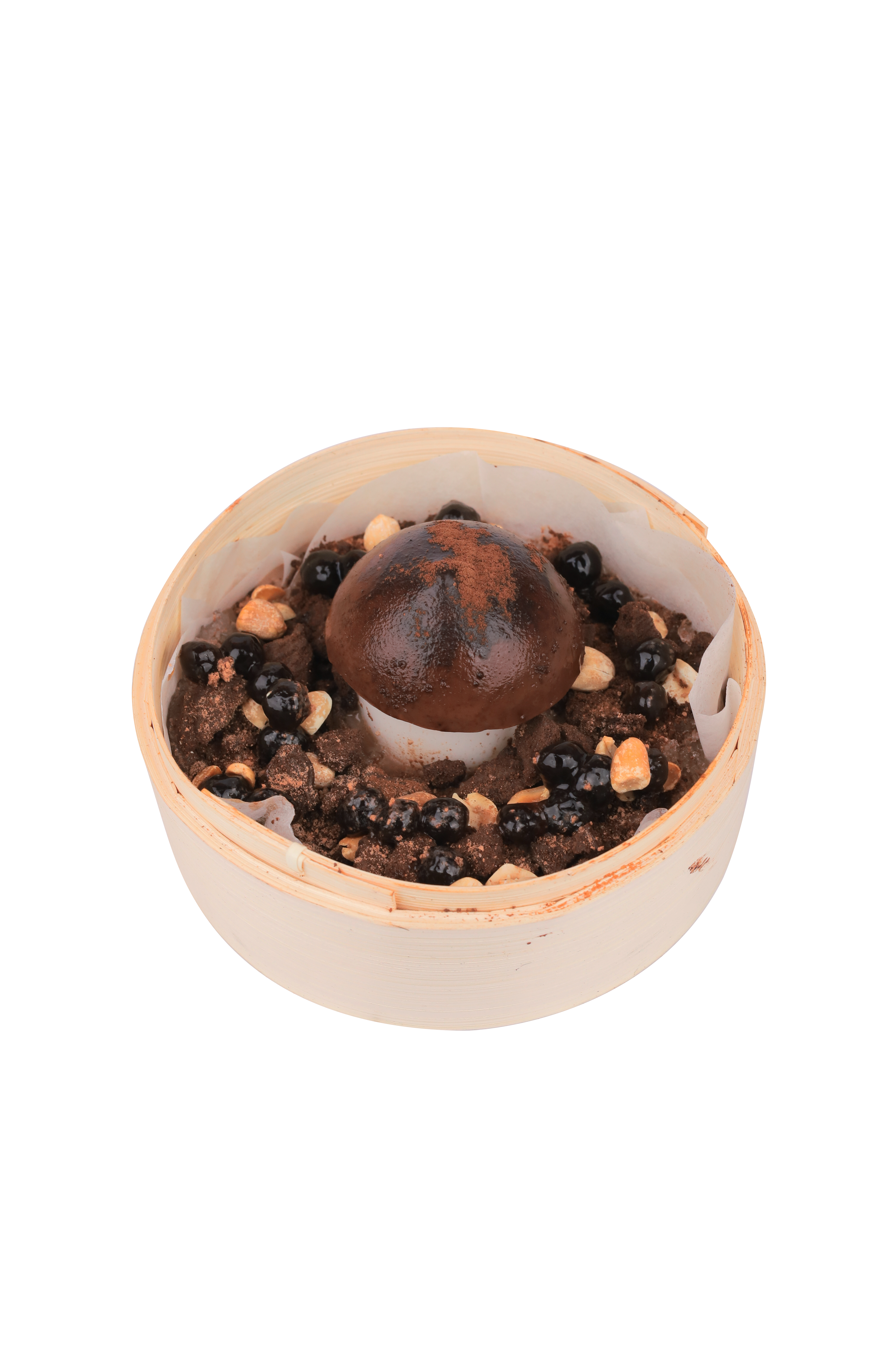- Sau đó, rắc 10g bột milo, 5g đậu phộng rang, 1/2 vá trân châu đen, 2 bánh Oreo nghiền nhỏ xung quanh chân nấm.