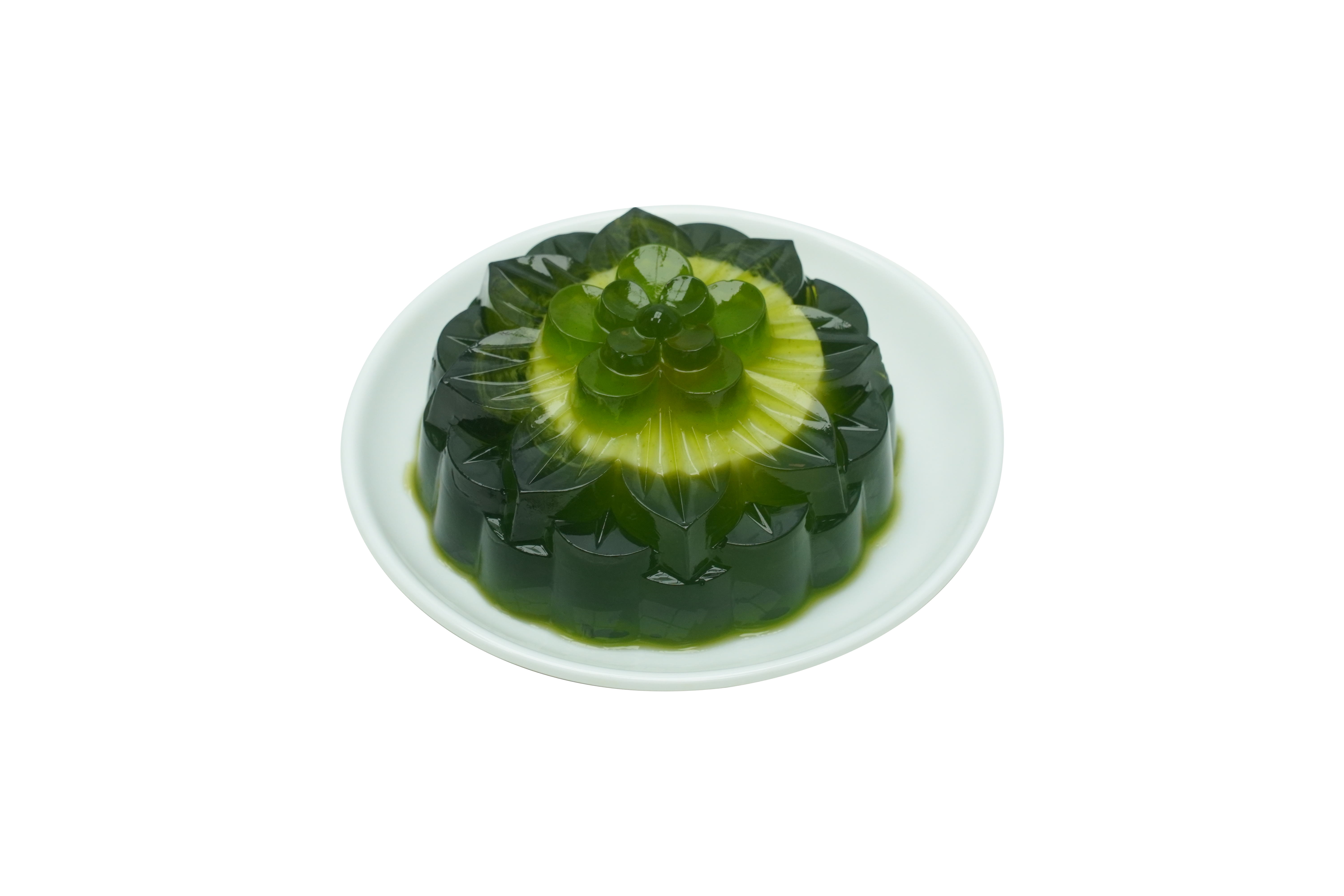 Bước 8: Thạch trà thái xanh bên ngoài: Dùng 450ml nước cốt trà thái xanh + 650ml nước thạch rau câu ở bước 5, khuấy đều và đổ vào khuôn bánh trung thu (kích thước: 9cmx9cmx4.5cm), mỗi khuôn dùng 110mml nước thạch. Cho phần thạch trà sữa ở bước 7 vào giữa khuôn. Thu được 10 phần.