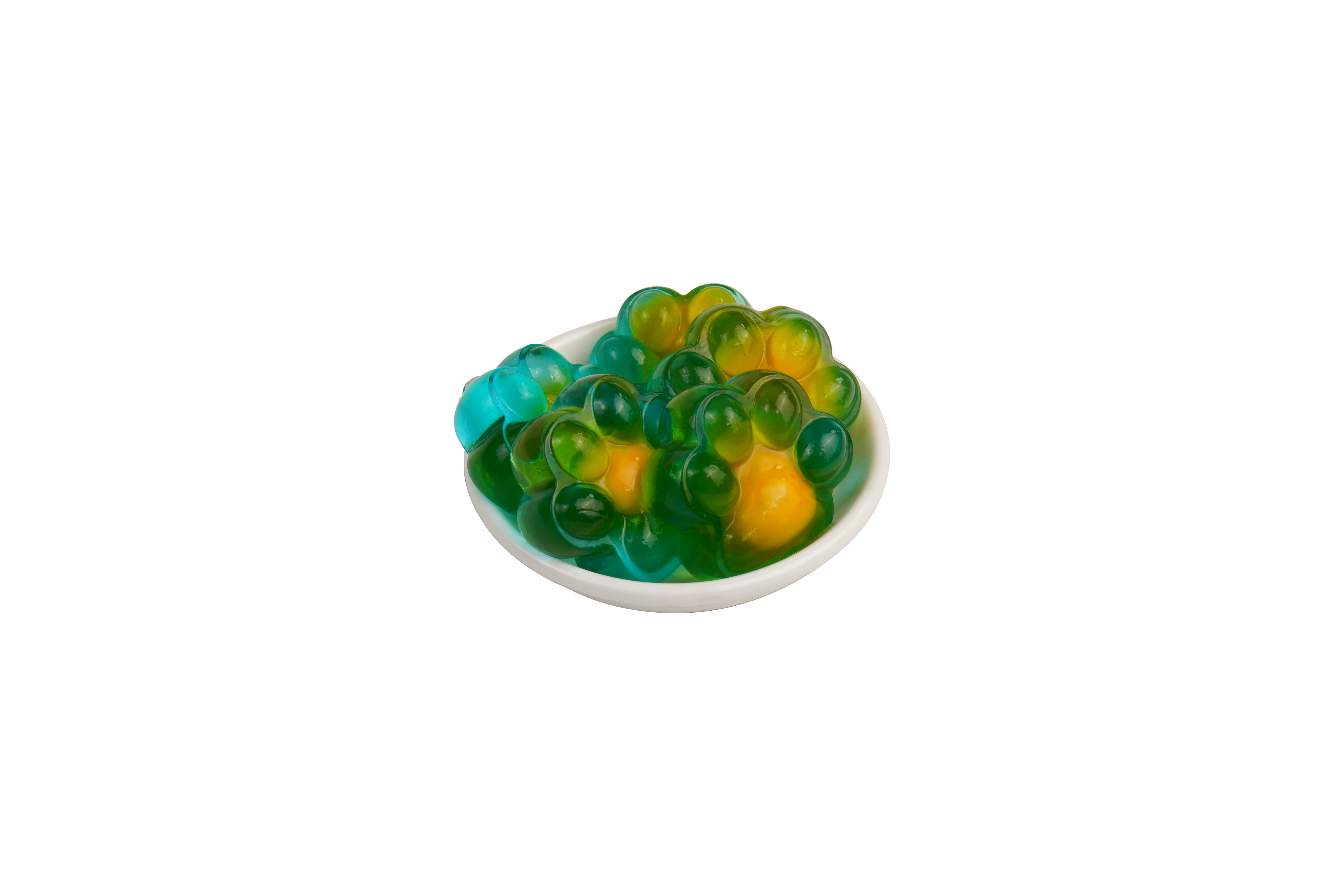 - Màu xanh dùng Siro Vỏ Cam: Hòa tan 30ml siro vỏ cam + 600ml nước thạch, khuấy đều hỗn hợp. Rót hỗn hợp thạch vào 1/3 khuôn chân mèo, đợi 3 phút cho thạch se bề mặt sau đó cho 5ml sốt phô mai tan chảy vào giữa, rót hỗn hợp thạch còn lại vào đầy khuôn. Thành phẩm thu được 30 chân mèo