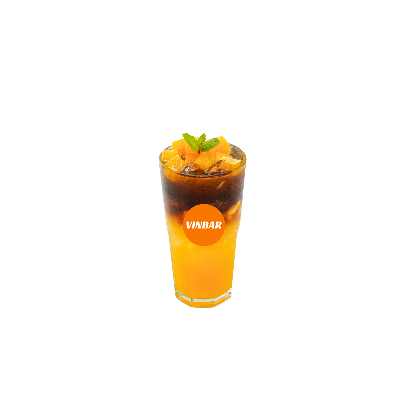- Bước 1: Cho 70ml nước ép cam + 20ml nước đường Hàn Quốc vào ly khuấy đều. Sau đó cho đá vào gần đầy miệng ly.