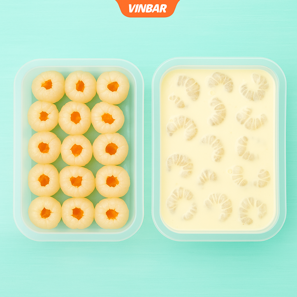 - KHUÔN NHỰA LÀM BÁNH PLAN 70ML: xếp 1 trái vải vào giữ khuôn, rót 50ml thạch khúc bạch vào sau cho nước thạch ngập hết mặt trái vải.