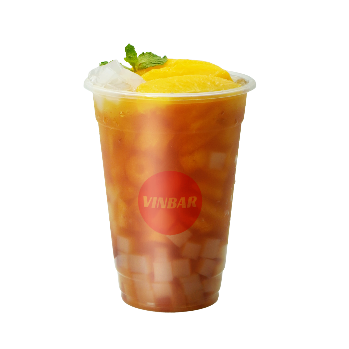 - Bước 2: Thêm đá đến gần bằng miệng ly, trang trí lên trên 3 lát đào và 1 lá bạc hà là hoàn thành.