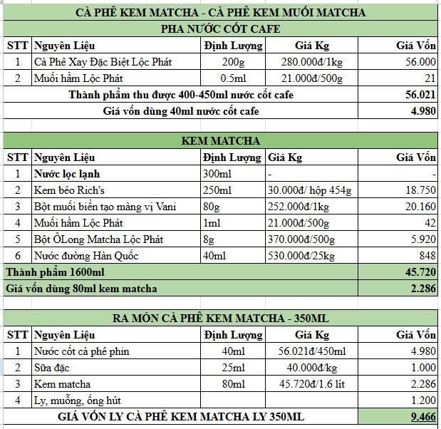 - Bước 4: Thành phẩm: Thu được khoảng 400–450ml nước cốt cà phê đen (56.021đ). Giá vốn dùng 30ml (3.735đ)